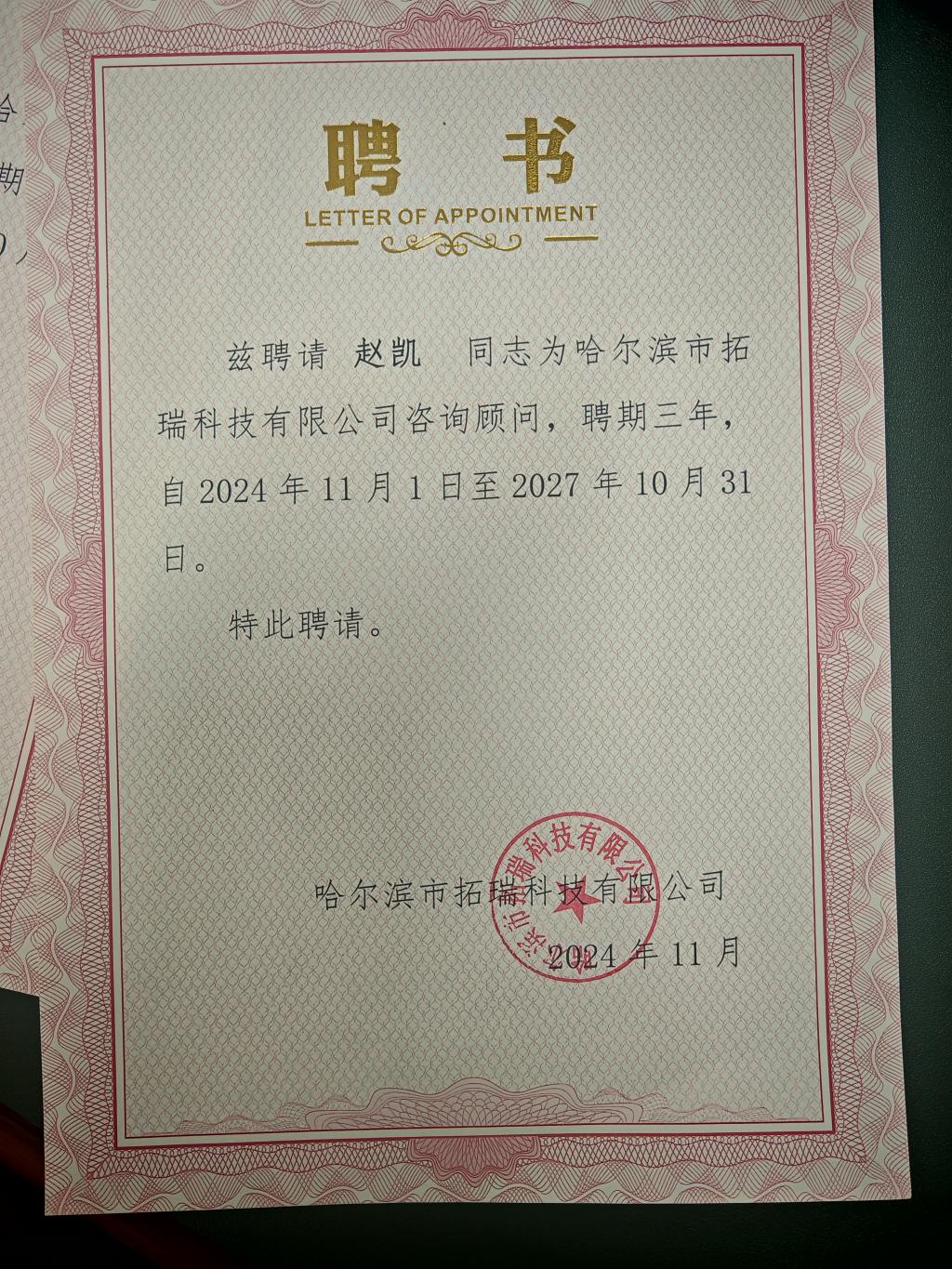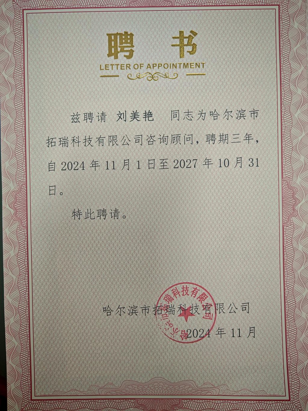 哈尔滨市拓瑞科技有限公司正式聘请哈尔滨金融学院的赵凯老师和刘美艳老师为咨询专家。哈尔滨市拓瑞公司在技术交流推广及人力资源服务领域成绩斐然,面对市场对人才要求的提升,公司策划系列培训课程并开展咨询活动,赵凯老师、刘美艳老师凭借专业素养受邀加入。