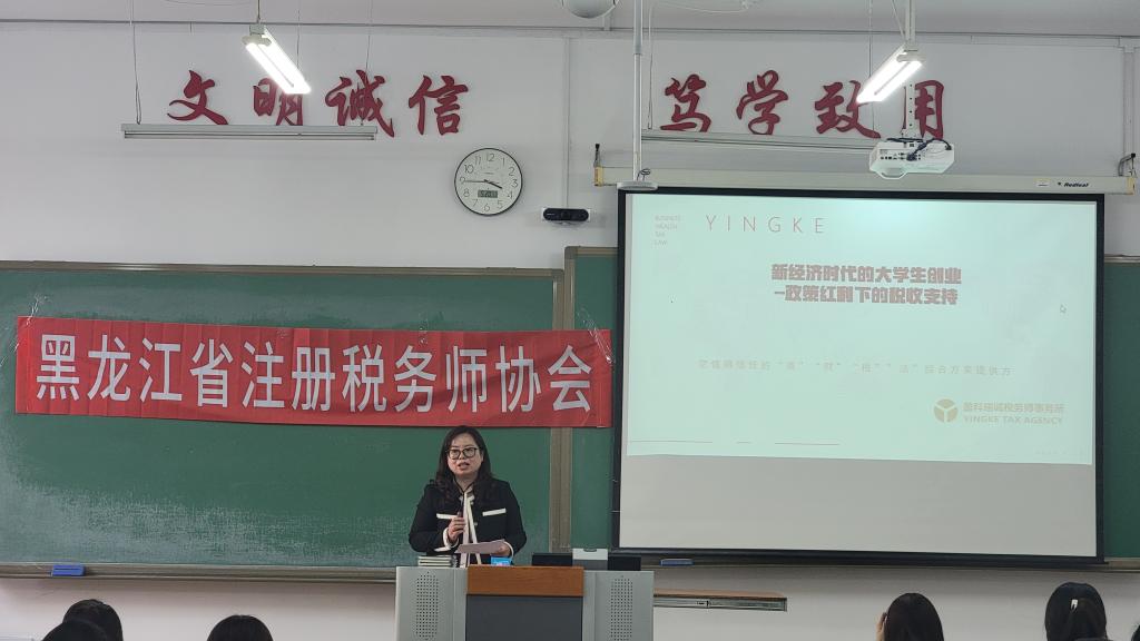 为深化校企合作、赋能学生职业发展,哈尔滨金融学院管理学院特邀哈尔滨盈科瑞诚税务师事务所陈世红主任,于5月20日下午为管理学院各专业学生代表开展题为《新经济时代的大学生创业——政策红利下的税收支持》专题讲座。管理学院副院长荣红霞主持活动,百余名师生共同参与。