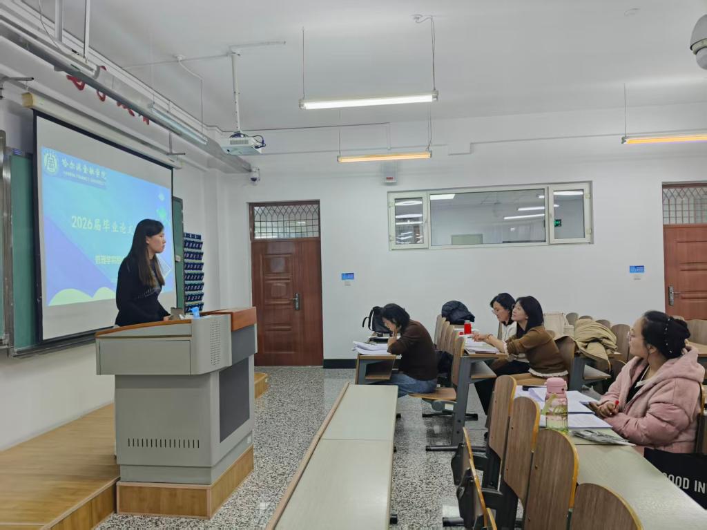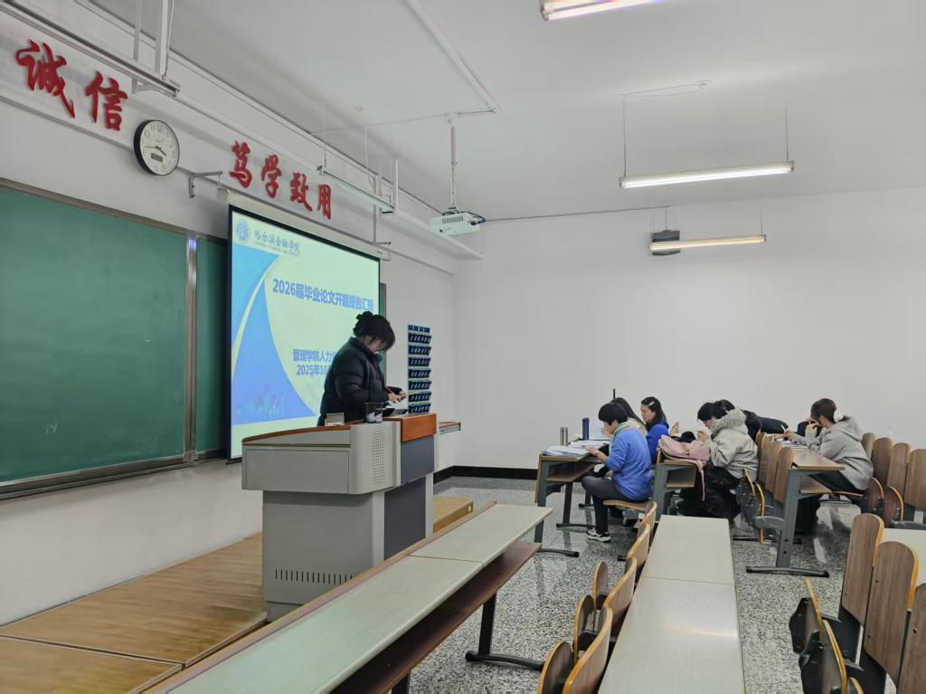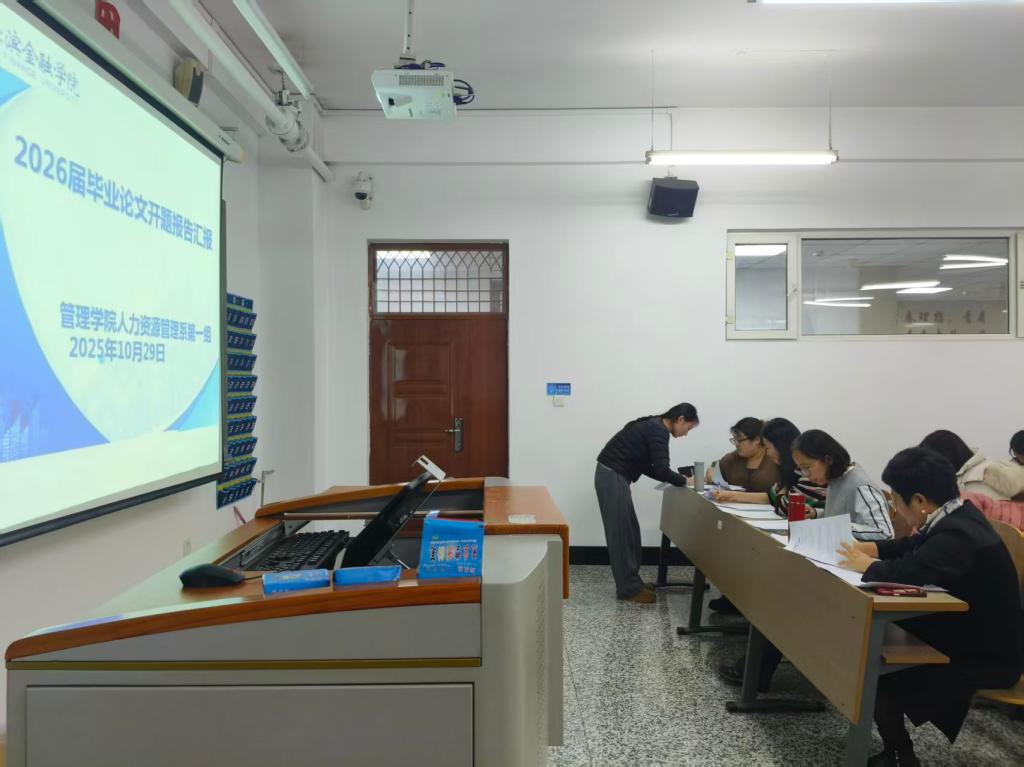 毕业论文是教学实践的关键环节,管理学院十分重视毕业论文工作。为进一步提升本科毕业论文质量,助力学生明晰论文的思路架构与框架体系,管理学院于2025年10月27日到10月31日期间,组织毕业论文开题汇报工作,全面检查本院2026届毕业生毕业论文选题及开题报告等是否符合学位论文要求。管理学院全体专任教师参加了开题汇报工作。