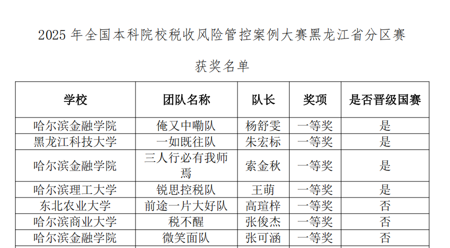 为应对基于大数据、互联网+所构建的智慧税务管理体系带来的理念与实践变革,促进高校之间及与实务界的深度交流,2025年全国本科院校税收风险管控案例大赛黑龙江分区赛于近日圆满落幕。
