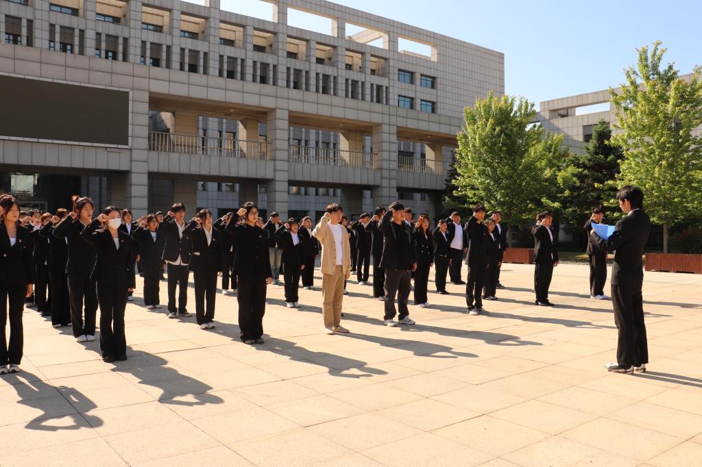 在宣誓环节,全体师生高举右拳,以青春之名庄严承诺。誓言掷地有声,彰显了管院人将个人成长融入国家发展的坚定决心。红旗飘扬之下,承载的是沉甸甸的责任与使命,是管理学院师生与时代脉搏同频共振的赤子之心。