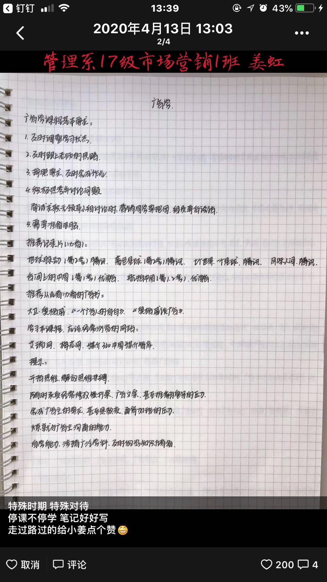 草长莺飞春意至,云端学习正当时。自新冠疫情发生以来,哈尔滨金融学院管理系深入贯彻落实党中央、教育部及学校党委关于疫情防控和线上教学活动的部署要求,基于网络平台营造优良学风,以务实的举措、细致的工作,切实做到“停课不停教”“停课不停学”,为学生成长成才提供全面而周到的服务。本周,管理系顺利完成“停课不停学,让优秀有‘记’可循”优秀笔记月冠军评选活动,同时“云课堂,不缺席”管理系辅导员进课堂活动亦在有序进行中。