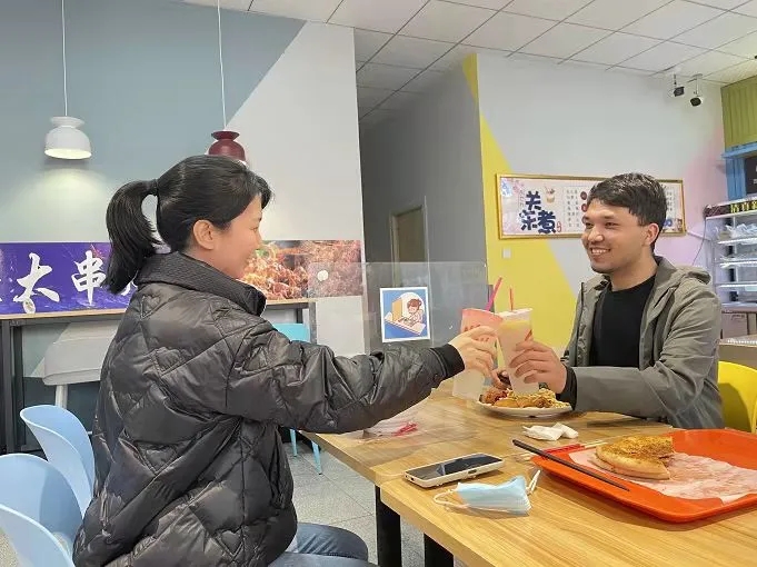 留校教师还与我系学生一起在食堂用餐、交流,以多渠道开展学生的思想政治教育工作,在疫情防控期间加强学生的人文关怀,促进老师对学生的了解,与其增进感情,让思政教育有广度、有深度、有温度。