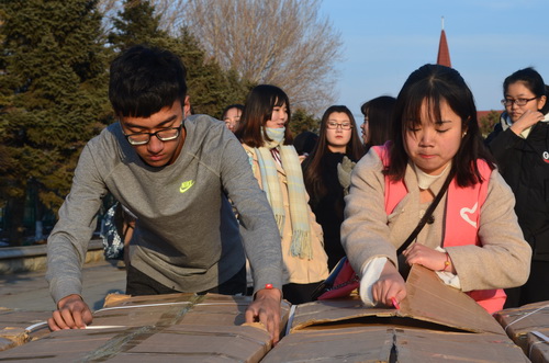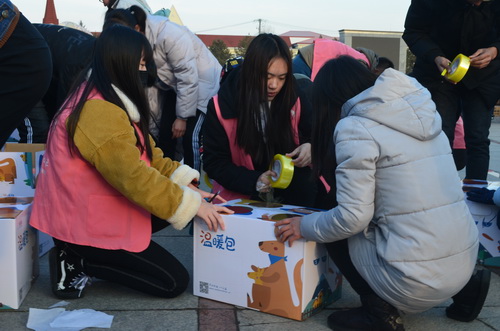 中午12点,在黑龙江科技大学科技广场上,管理系红丝带爱心社的140余名志愿者开始了爱心分装活动。从搬运物资、分装物资、检查清理到封箱摆放,一切井然有序,只为给灾区儿童们送去帮助和温暖。尽管天气寒冷,但志愿者们干劲十足,沉重的物资划破了手,他们依旧坚持,惟愿能为呵护那些苦难的儿童献出绵薄之力。下午6点,经过所有志愿者五个多小时的努力,共715个温暖包物资分箱完成并整装待发!爱心社志愿者们分拣的包裹数量约占总数的三分之一,在此次志愿活动中被评为优秀志愿服务团队。