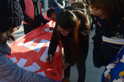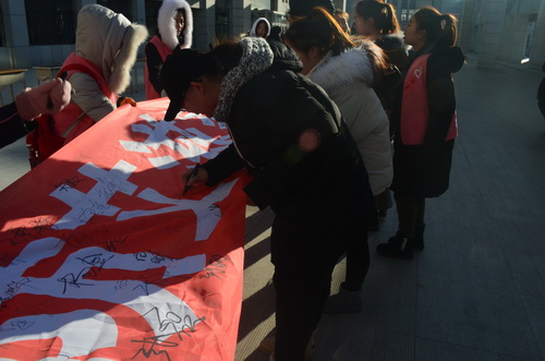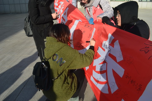 在管理系学生会主席、红丝带爱心社社长袁赫的带领下,爱心社成员提前做好准备工作,在活动地点等待同学们的到来。寒风刺骨,但志愿者们热情不减,为让更多的人了解艾滋,加入到防艾预艾的活动,志愿者们向同学们分发防艾知识手册,大家深受感染,自发来到条幅前参与签名活动,在条幅上留下爱的痕迹,以此表达对艾滋病患者的关爱。管理系学子的积极参与不仅温暖了志愿者,更是在这寒冷的冬天感染着每一个人!