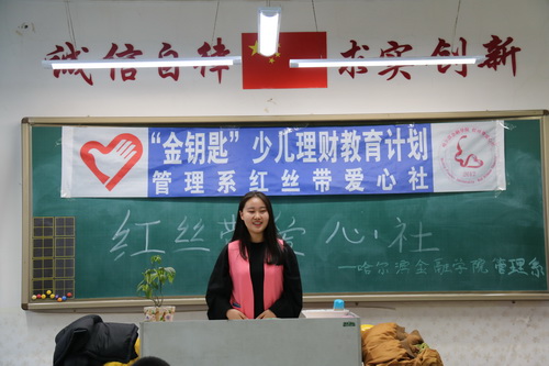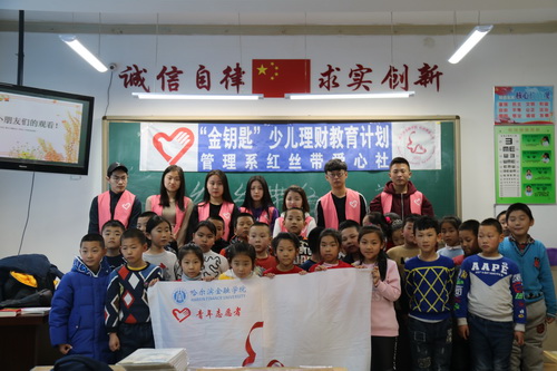 为响应十九大“反对奢侈浪费和不合理消费”的号召,贯彻落实“推动社会主义文化繁荣兴盛,坚持全民行动,从娃娃抓起”的十九大会议精神,提高青少年的金融意识和理财技能,帮助国家培养新一代金融人才,管理系红丝带爱心社于2017年12月11日来到通乡小学开展“金钥匙”少儿理财教育计划活动。