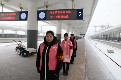 在大雪纷飞的清晨,28名志愿者无畏恶劣的天气,准时到达活动地点,在总站负责人分配任务后,志愿者们立即在各自岗位上就绪,开始了引导咨询、维持秩序、重点帮扶等各项工作。负责维持秩序的志愿者们,在户外站台处坚守岗位,认真工作,他们的双手、脸颊冻得通红,但脸上却挂着一丝丝微笑。负责引导咨询工作的志愿们,奔波在检票处、售票口、进站口等地,为乘客提供便捷的服务。在完成所分配的任务后,志愿者们与专业人员配合,共同完成扫雪工作。