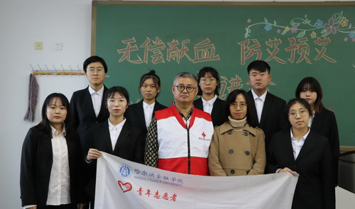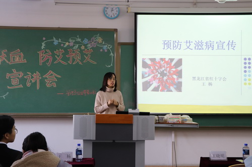 会议伊始,黑龙江省红十字会组宣部主任科员王杨为同学们详细介绍了艾滋病及其相关预防知识,消除了同学们对艾滋病恐惧心理的同时也让大家明白了约束自我、保护自我的重要性,提高了同学们的防范意识。黑龙江省红十字会无偿献血志愿服务队队长王晓明为同学们讲解了无偿献血的意义、捐献所得血液的用途以及献血时的注意事项,并鼓励同学们积极参加无偿献血活动,用爱心为生命加油。细致的讲解使同学们对无偿献血有了全新正确的认识,同学们也积极表示作为大学生应成为献血活动的积极响应者,为社会公益奉献出自己的一份力量。