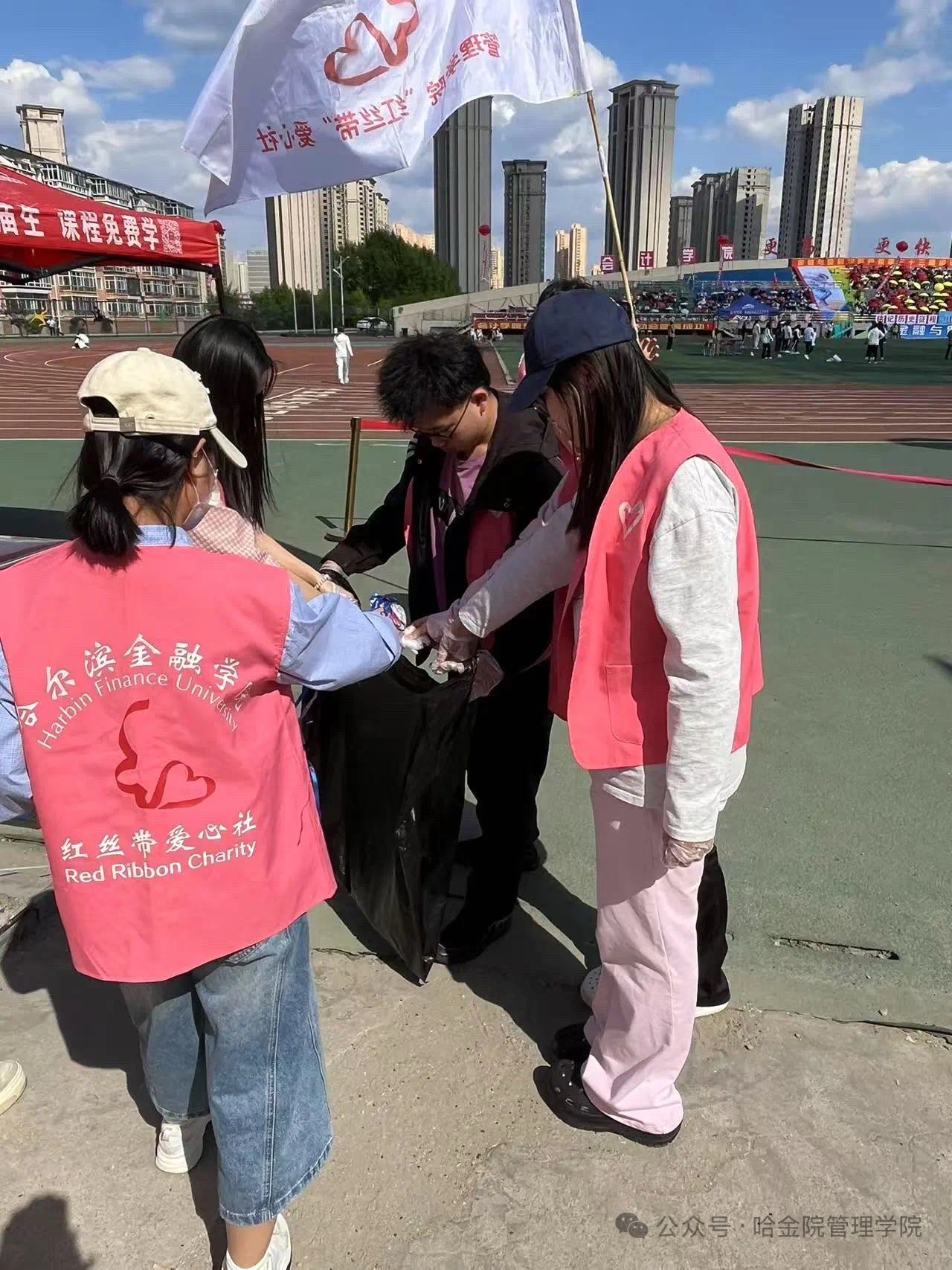 运动会的两天时间内红丝带爱心社分布成11个小组,他们手持垃圾袋,紧锣密鼓地按班次形成小组行走在运动场的各个角落完成任务,时刻关注着场地卫生情况,确保赛道及观众区域整洁有序。