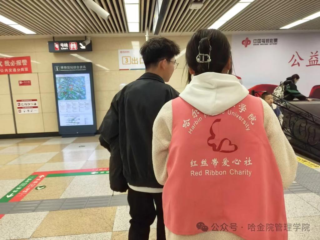 为了培养同学们的社会责任感和公民意识,弘扬我院学子的志愿者奉献精神,增强学生们的组织协调能力和团队协作能力。管理学院红丝带爱心社于11月23日在哈尔滨地铁一号线博物馆站开展志愿服务活动。