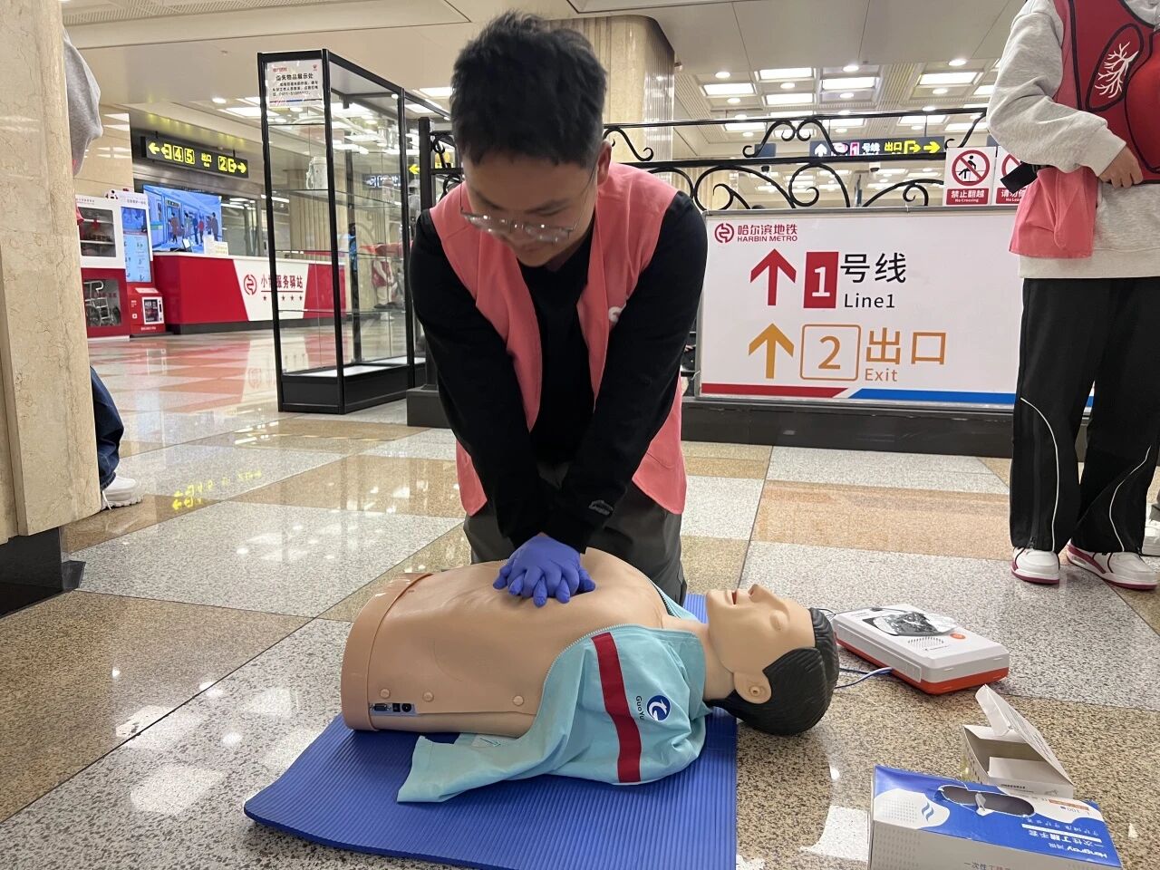 当意外突袭的瞬间,专业的应急救护能力便是守护生命的“最后一道防线”。为厚植“人人学急救,急救为人人”的红十字精神,切实提升学子应对突发状况的实操能力,管理学院于11月15日14时创新开展实践教学,将课堂搬进博物馆地铁站,联合哈尔滨红十字会倾力打造“生命接力站”应急救护公益普及课。课程兼具专业性与实用性,为管理学院24、25级共17名红丝带爱心社成员及过往市民系统普及急救知识、传授实操技能,为大家的生命安全增添了坚实“安全砝码”。