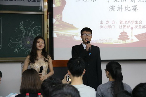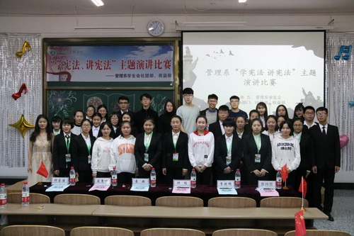 为贯彻落实党的十九大坚持依法治国,坚持全面从严治党,坚持党对一切工作领导的会议精神,弘扬法制精神,普及宪法知识,管理系于2017年11月14日在新教223举办了“学宪法,讲宪法”主题演讲比赛总决赛。