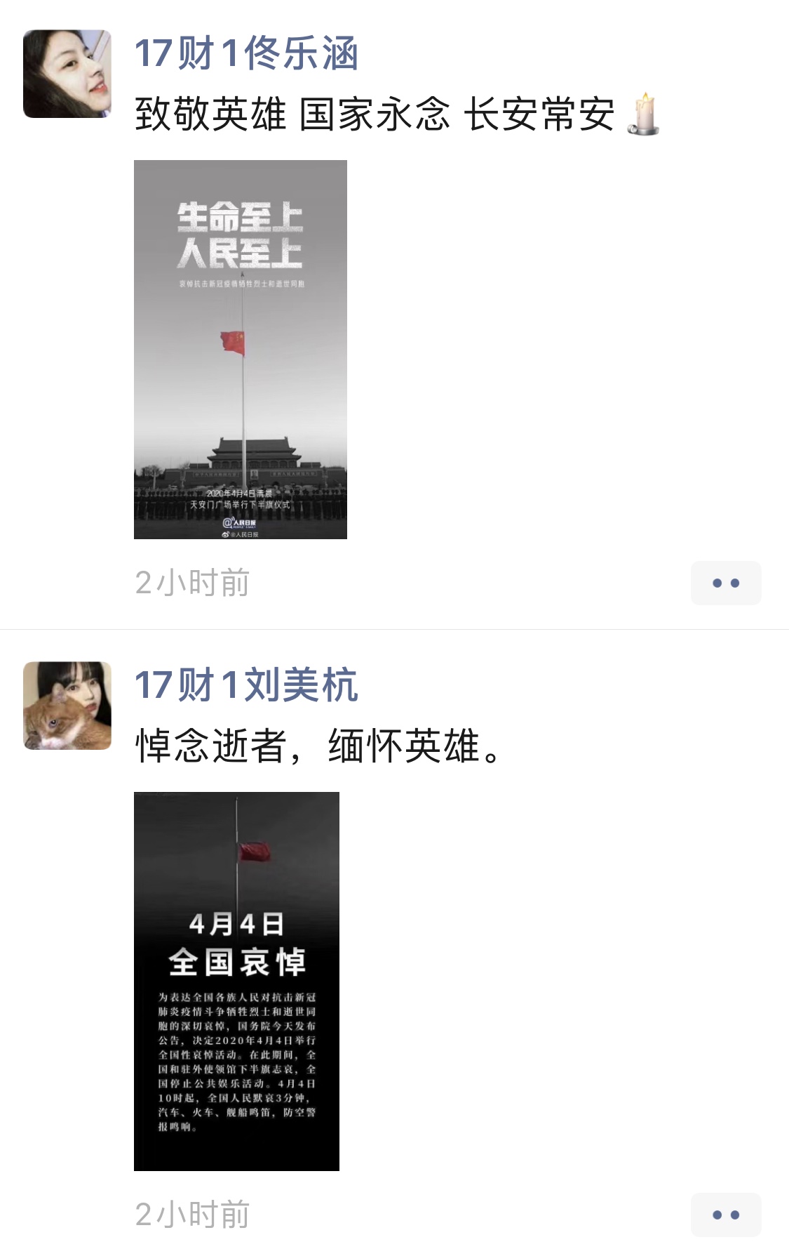 为表达对抗击新冠肺炎疫情斗争牺牲烈士和逝世同胞的深切哀悼,国务院发布公告,于2020年4月4日举行全国哀悼活动。在此期间,全国和驻外使领馆下半旗致哀,全国停止公共娱乐活动。与此同时,管理系师生们也通过居家默哀、朋友圈发文等方式致敬在抗击新冠肺炎疫情中牺牲在战斗一线的“逆行英雄”,缅怀疫情中逝去的同胞。