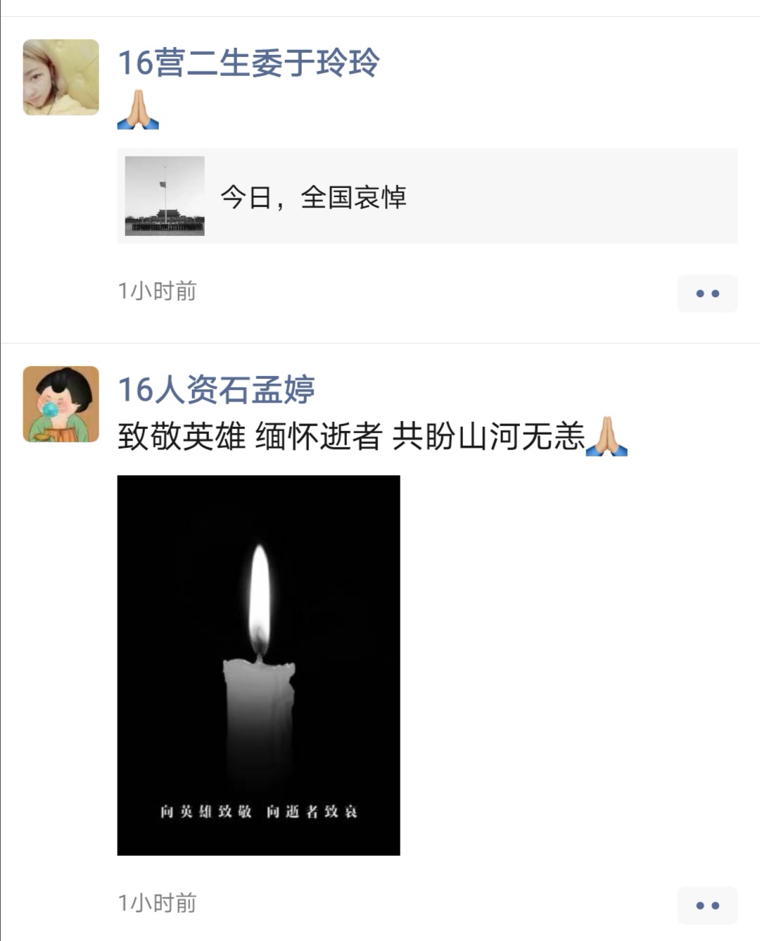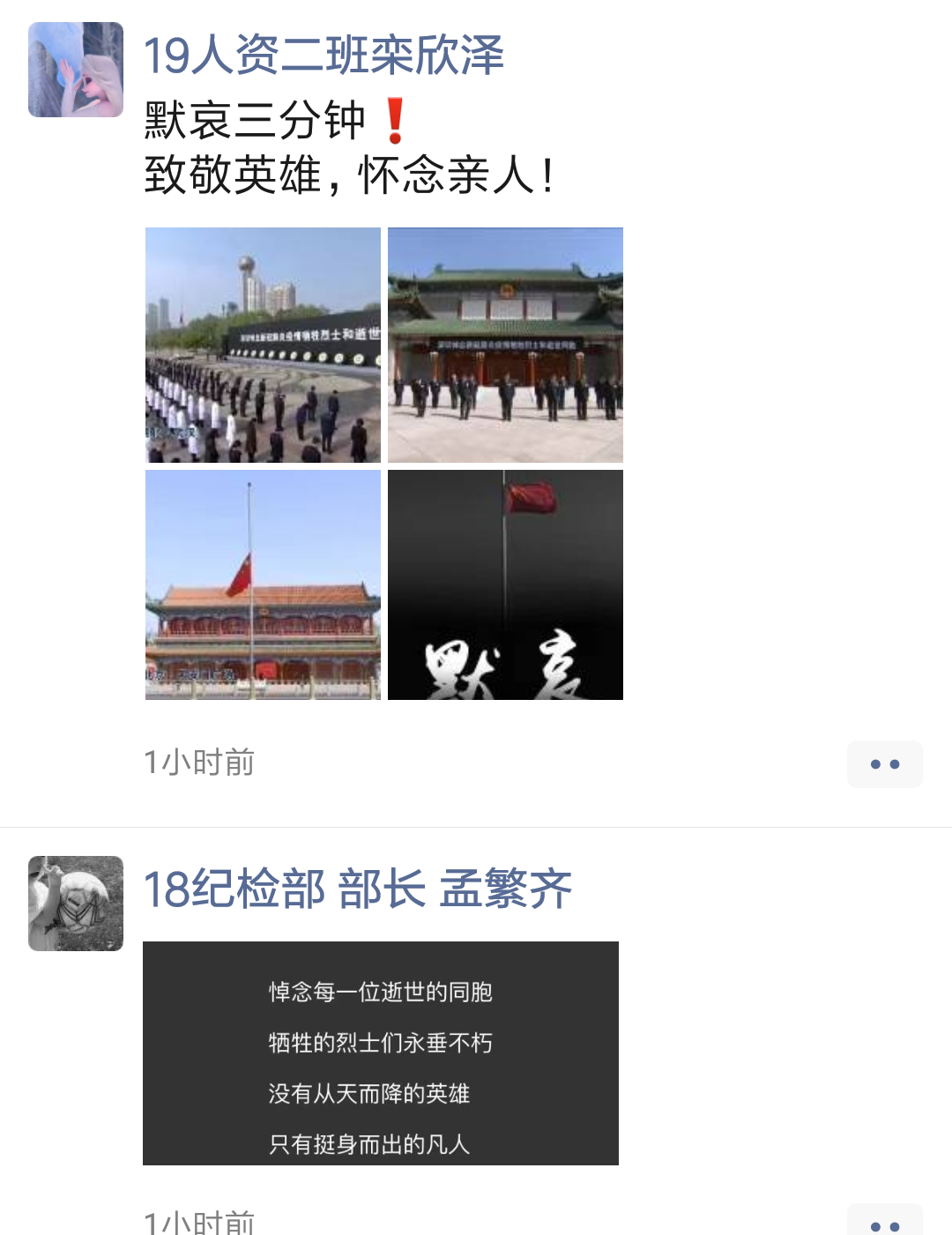 2020年4月4日上午10点,我系师生在线观看“深切悼念新冠肺炎疫情牺牲烈士和逝世同胞”特别直播,并参与悼念活动。抗疫英雄充分展示了“国有战、召必回、战必胜”的奉献精神,无论遇到多大的风雨,都不能阻止我们“爱党、爱国、爱家、爱英雄”的深情和团结一致、攻坚克难的步伐,我们为伟大祖国和伟大人民感到无比骄傲,牺牲烈士和逝世同胞永垂不朽,他们的精神将永远鼓舞着我们前进。10时整,防空警报响彻天空,国旗半降,我系师生自行伫立默哀3分钟,并纷纷通过朋友圈发文等方式向所有在这场疫情中不幸罹难的同胞致以深切哀悼,向所有为抗击疫情付出宝贵生命的英雄致以崇高敬意。
