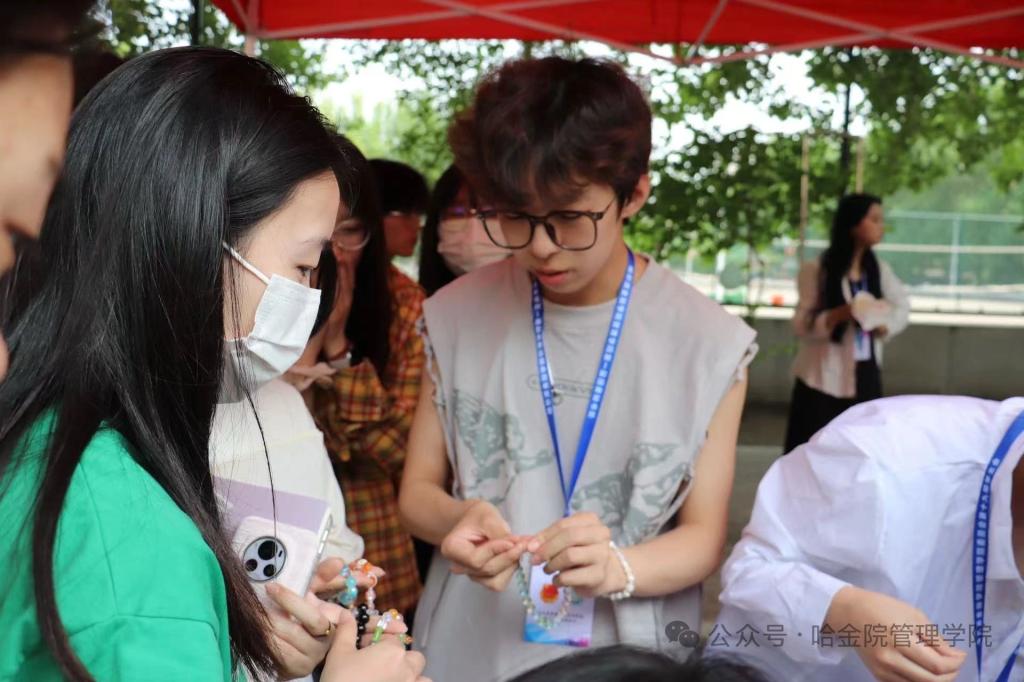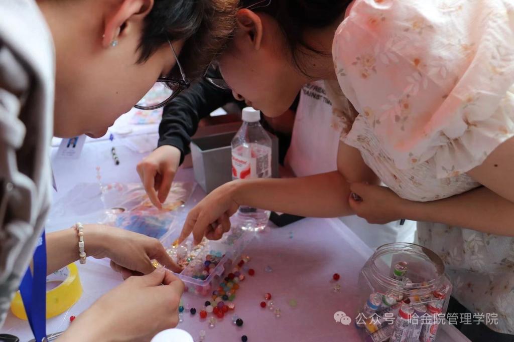 二食堂门口的“珠连心缘”手链制作活动更是人气爆棚。在这里,大家化身为心灵手巧的设计师。同学们或参照设计图,或凭借天马行空的想象,用镊子、弹力线等工具精心穿缀,将零散的材料组合成专属手链。