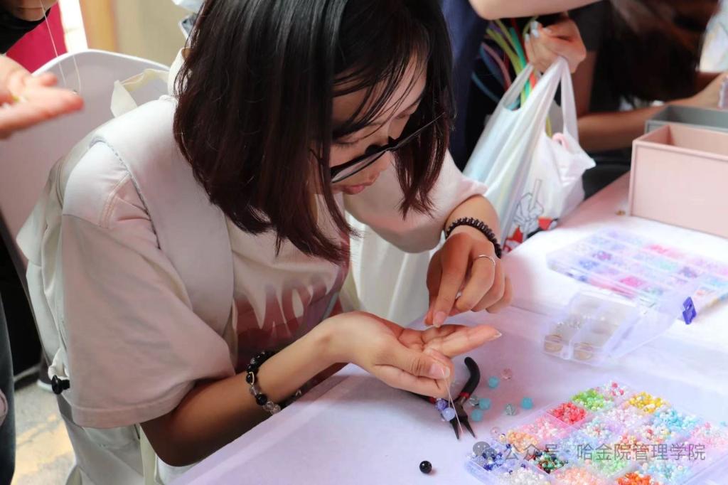 在穿珠的过程中,时间仿佛慢了下来,同学们沉浸在创作的宁静中。这一条条凝聚着创意与巧思的手链,不仅是时尚的腕间装饰,更是大家珍视自我、鼓励自我的情感纽带,时刻提醒着要爱自己、悦纳自己。活动里的每一个环节都像是一把钥匙,打开了同学们紧锁的压力之门,让大家沉浸愉悦的游戏氛围里重拾轻松心态。