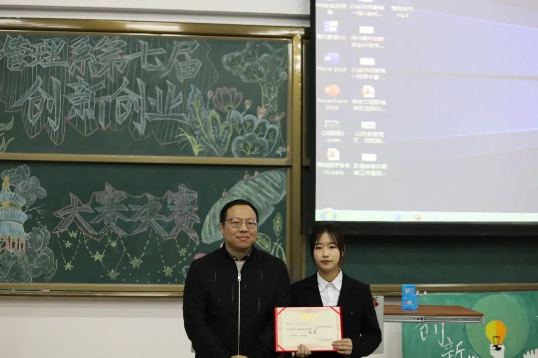 统分结束后,主持人宣布获奖情况如下:一等奖 人间充电站,二等奖 角落啡楼、债见APP,三等奖 待兴市场、有汉服装工作室、丝藏阁,优秀奖 校园无感支付、茶舍有限责任公司、同城医疗助手、DIY手工室与解压馆。由评委团为每一位获奖选手进行颁奖并合影留念,祝贺他们付出的努力与拼搏都取得了美好成果。至此,管理系第七届创新创业大赛决赛圆满落幕。
