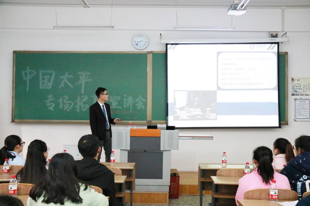 为了帮助大学生就业,为大学生明确就业趋势,指明就业道路,找到适合自己的工作。在2017年10月24日下午1点30分,中国太平人寿保险公司主要针对管理系2014级毕业生在新教112召开了专场招聘宣讲会。管理系辅导员王长奇老师出席此次宣讲会。