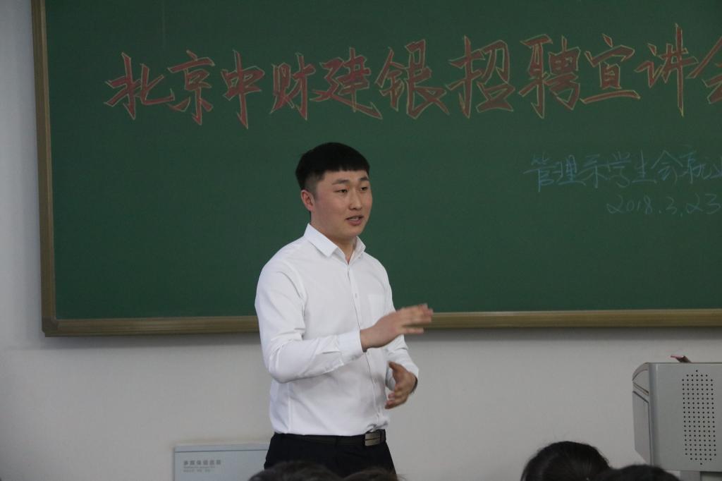 每个应届毕业生的梦想大概就是毕业就可以上岗了,可是幸运儿又有多少呢,近年来就业难问题越来越成为每个应届大学生的头疼事,为了缓解本校这一难题,管理系携手北京中财建银管理有限公司于本周五下午一点半在新教103举办专场招聘会,管理系辅导员王长奇老师出席此次招聘会。