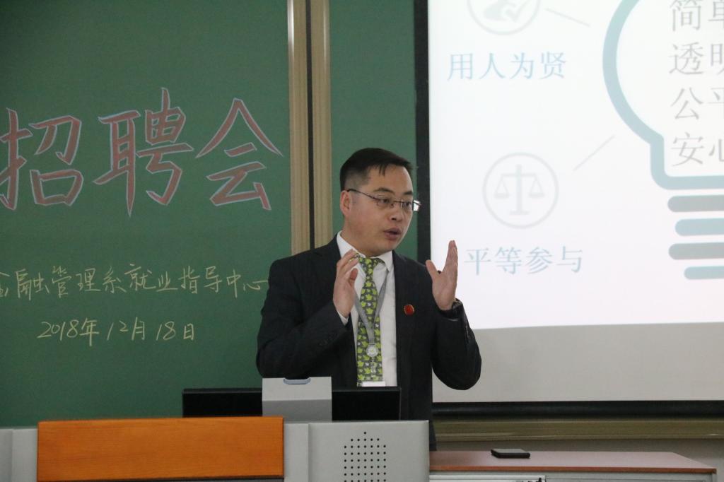 近年来,中国高校毕业生数量持续增加,国内大小企业对于人才的需求也是有增无减,但大学生毕业时却仍面临着“就业难”,大小企业也都重复着“招人难”的问题。如何让大学生找到心仪的工作,企业招聘到合适的工作人员,已经成为亟待解决的难题。对此,管理系携手万科物业于2018年12月18日在新教111举办了专场招聘宣讲会,管理系辅导员郭爽老师出席此次招聘会。