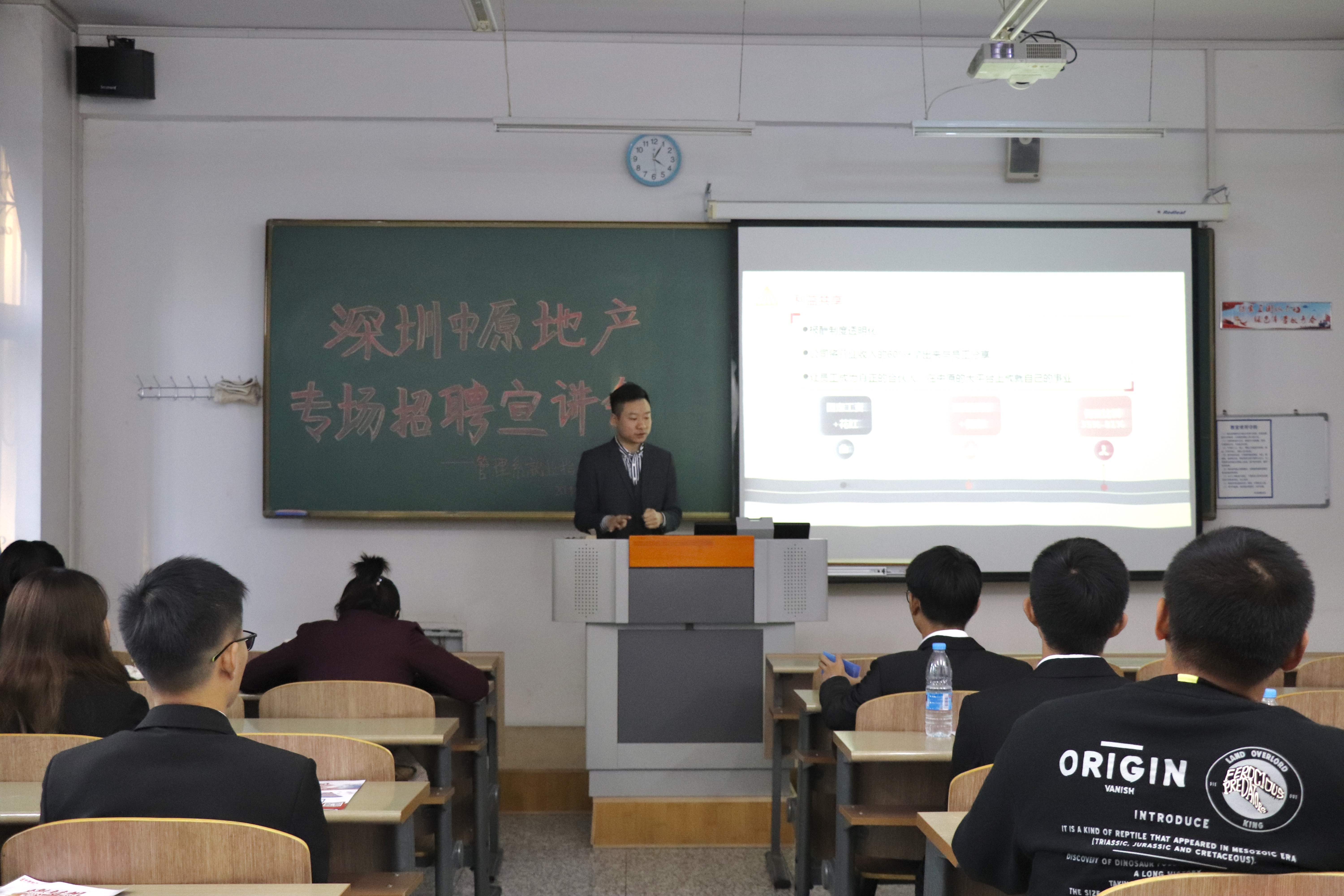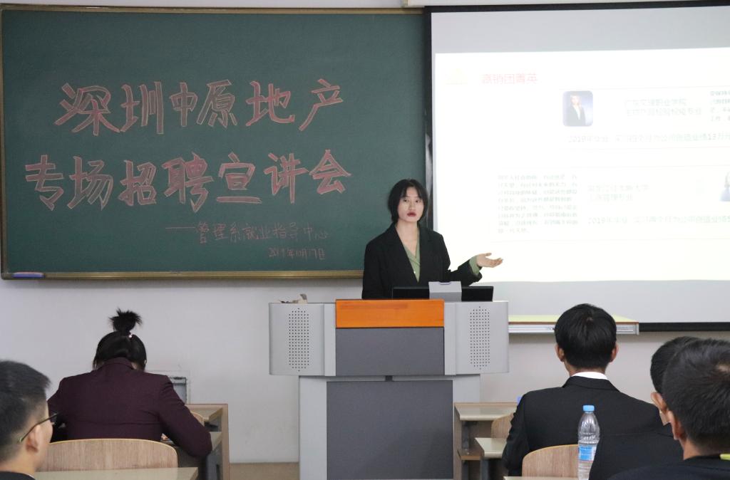 目前大学生就业成为了一个大难题。许多大学生不清楚自己毕业后的发展方向,不了解自己擅长什么,对自己以后的工作一片迷茫。还有许多人找到工作后任性的跳槽,辞职因此就业困难,就业压力大成为了很普遍的问题。为了缓解就业问题,管理系携手深圳中原产地公司于10月17日在综合楼118教室举办了专场招聘宣讲会管理系辅导员卞超凡老师出席此次招聘会。