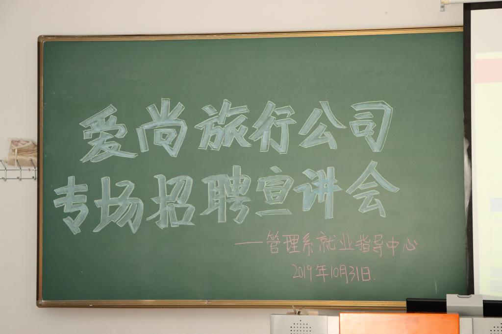 博士生一走廊,硕士生一礼堂,本科生一操场。一个招聘人数不多的岗位,前来应聘的常常有上百个研究生或是上千个本科生。”这是一位女大学生对某大城市招聘会现场的描述,当今大学毕业生就业压力之大,由此可见一斑。为了缓解就业问题,管理系携手于爱尚旅行(北京)国际商务服务有限公司于10月31日在综合楼118举办了专场招聘宣讲会。管理系辅导员卞超凡老师出席此次招聘会。