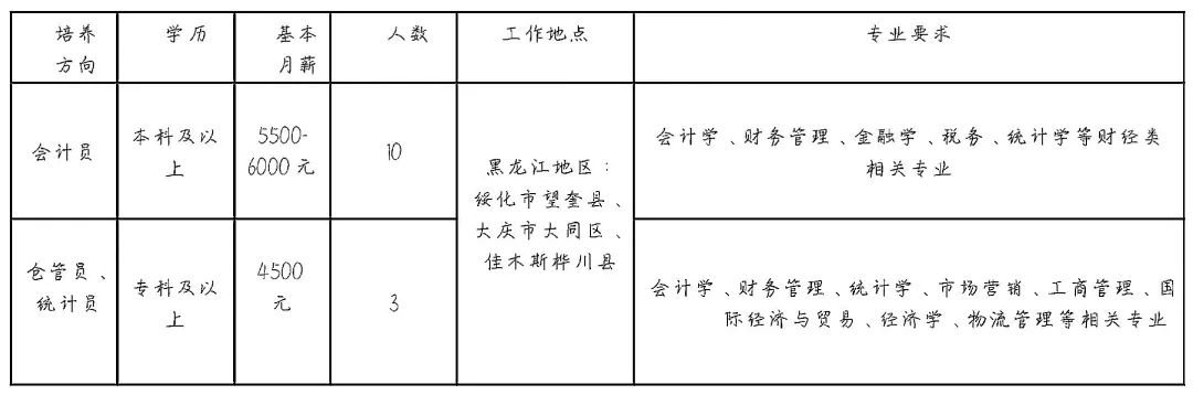 此次线上招聘会介绍了公司的基本概况,此次招聘会宣讲会主要招聘岗位:1.会计员,要求:学历本科及以上,基本月薪5500-6000,人数10人,专业会计学,财务管理,金融学,税务,统计学等财经类相关专业。2.仓管员、统计员,要求:学历专科及以上,基本月薪4500,人数3人,专业会计学、财务管理、统计学、市场营销、工商管理、国际经济与贸易、经济学、物流管理等相关专业。工作地点:黑龙江地区:绥化市望奎县、大庆市大同区、佳木斯桦川县。