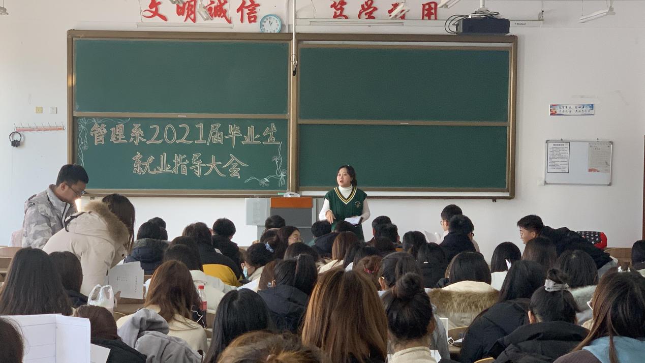 在疫情常态化背景下,为进一步做好2021届毕业生就业指导与服务工作,2020年10月26日,管理系17级毕业生就业动员暨就业指导大会在综合楼223教室举行。管理系毕业班辅导员宋春晓、赵玉莹老师分别召开年级会议,讲解就业形势、就业协议签署、实习、户籍、改派等问题,帮助毕业生提升理念,增强就业竞争力,管理系2021届全体毕业生参会。
