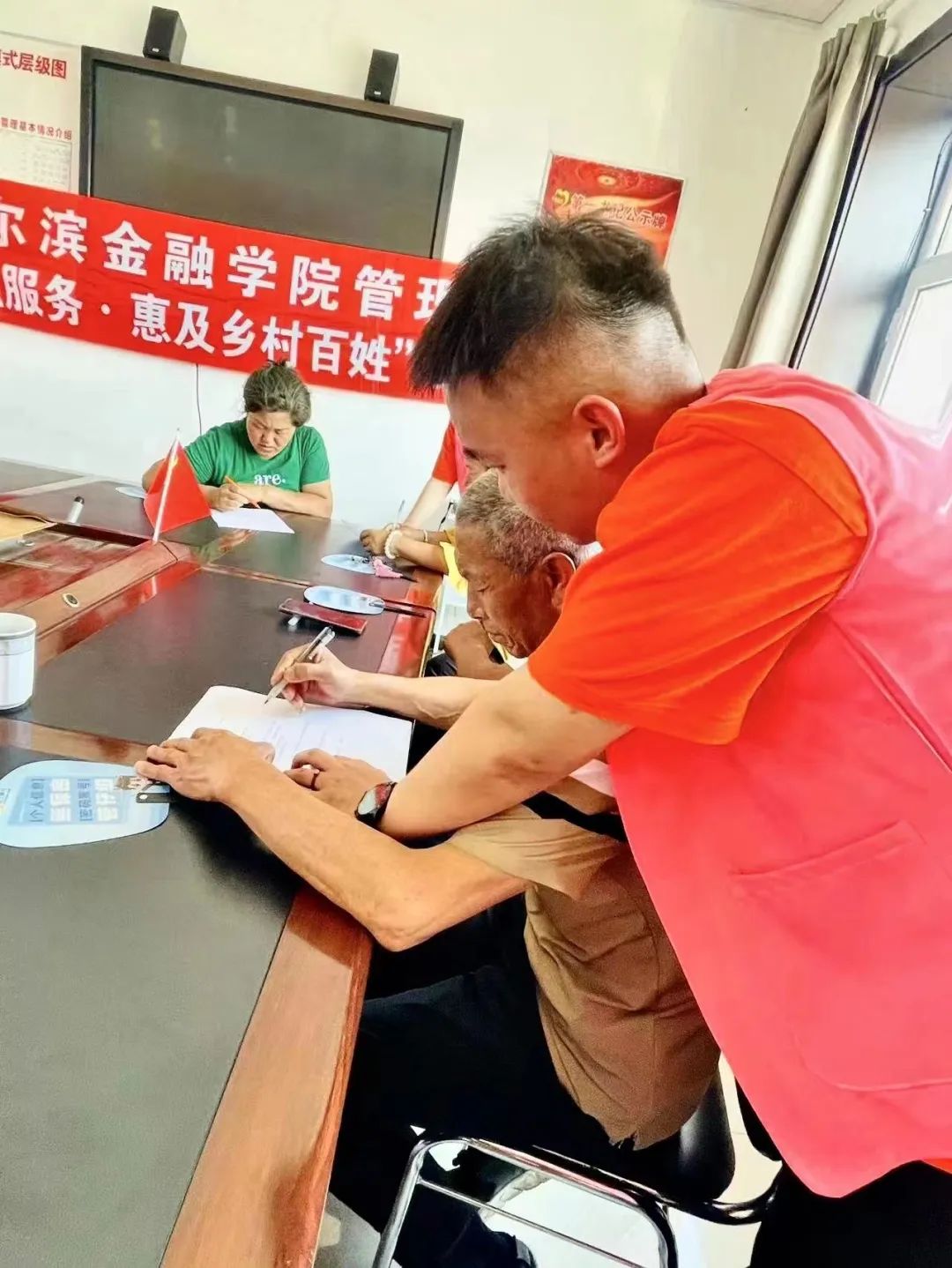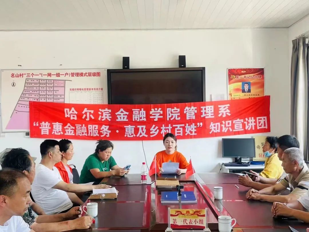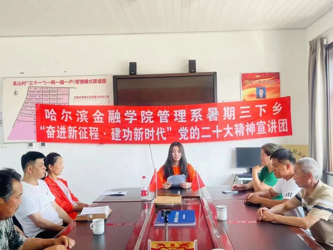 26日下午,实践团成员赴名山镇进行调研与宣讲。宣讲开始前,管理系学生第一党支部书记宋春晓老师向全体到场的村民表示热烈的欢迎,强调此次宣讲的目的是让村民理解二十大精神的深刻内涵,同时调研村民对金融知识的了解情况。随后由管理系学生会执行主席国心雨和管理系学生会团总支副书记楚中垚开展“奋进新征程,建功新时代”二十大精神宣讲,她们用通俗易懂的语言深刻阐述了新时代农村党员干部的责任和义务,教育引导村民代表要深刻领会党的二十大精神实质,全面提升乡村治理能力,锤炼过硬组织能力,充分发挥党建引领作用,增强基层党组织的凝聚力和战斗力。接下来,由管理系学生活动联合会主席隋欣航和管理系红丝带爱心社秘书长宋子平进行“普惠金融服务,惠及百姓乡村”知识宣讲,践行以人民为中心和为人民办实事的初心使命,用简练生动的语言向村民介绍新型诈骗手段及辨别假币的方式方法,旨在增强人民群众对非法金融活动的识别和自我保护能力,为人民群众的生命财产安全提供保障。同时实践团还邀请村民做相关调查问卷,进一步了解基层群众对金融知识的了解程度,为村委会日后加强金融知识普及、宣传活动奠定基础。