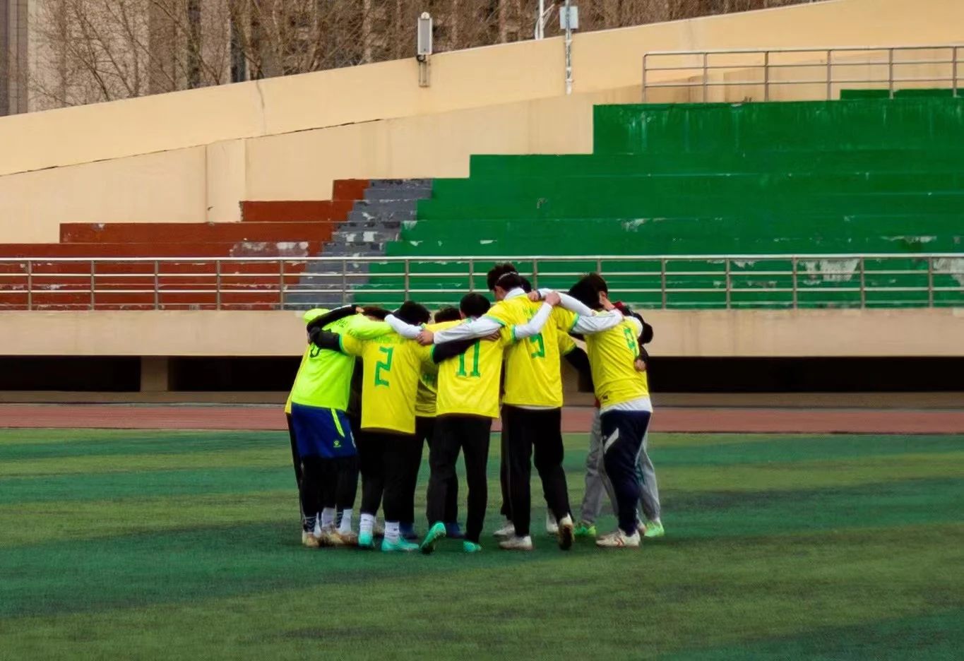 此图的背景为2023年11月4日管理学院和计算机学院的一场“六院联赛”的决赛,我院男足足球队员团结一心,拼尽全力在最后1:1的情况下,点球4:2拿下了决赛,获得了本次六院联赛的冠军。