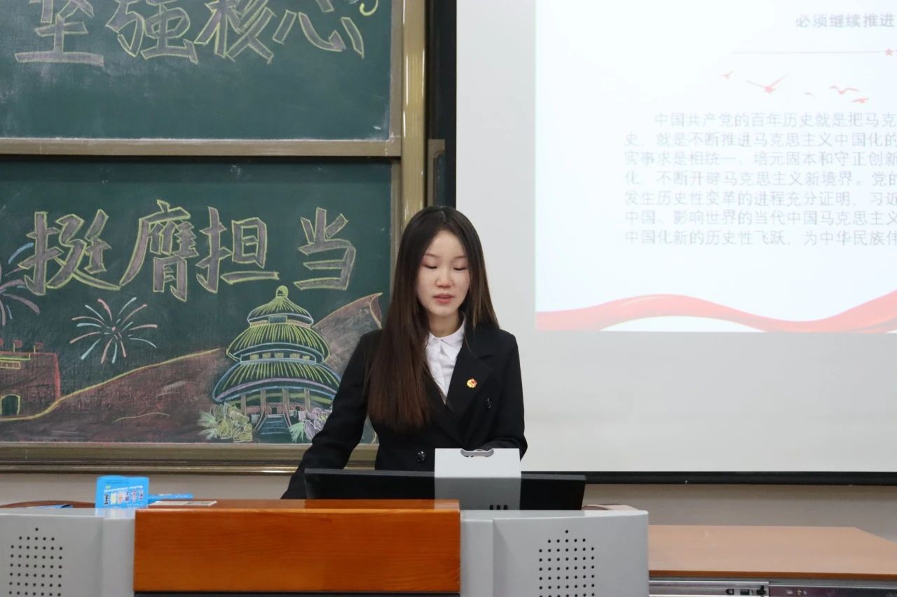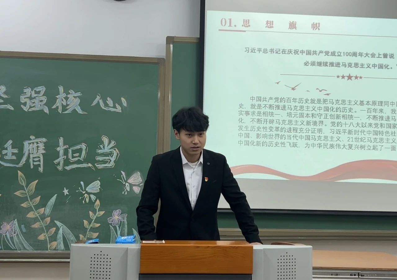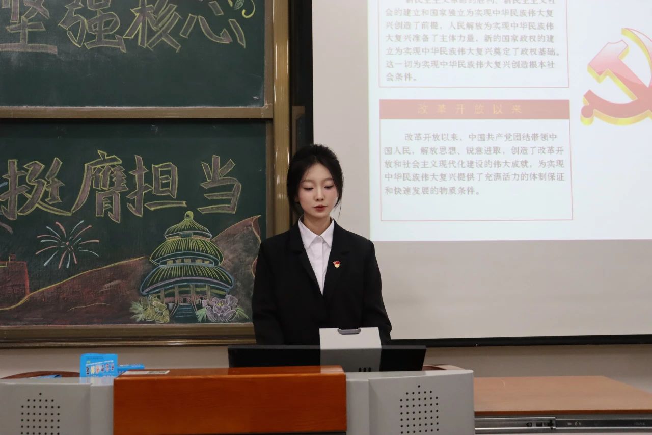 此次宣讲活动共分为四个主题。首先是思想旗帜,宣讲人员以马克思主义为核心,切合三个要点,着重强调了四个意识,四个自信和两个维护,讲述了在思想上政治上行动上与党保持高度统一的必要性。其次是坚强核心,此次宣讲要求同学们坚定核心内容,坚定理想信念,加强组织观念,提高领导能力,增强服务意识,培养道德品德,引导大家深刻领悟两个确立,鼓励锤炼忠诚干净的政治品格。接着是复兴担当,宣讲人员围绕强国复兴,从新民族主义胜利时期到中国特色社会主义新时代,以使命担当强化思想建设,提高大局意识。最后一个模块是共创未来,此模块以一个视频为引,更是激发了管理学院学子们内心的共鸣,坚持实践逻辑,不断提高执行力,进一步深化对习近平新时代中国特色社会主义思想的学思践悟。