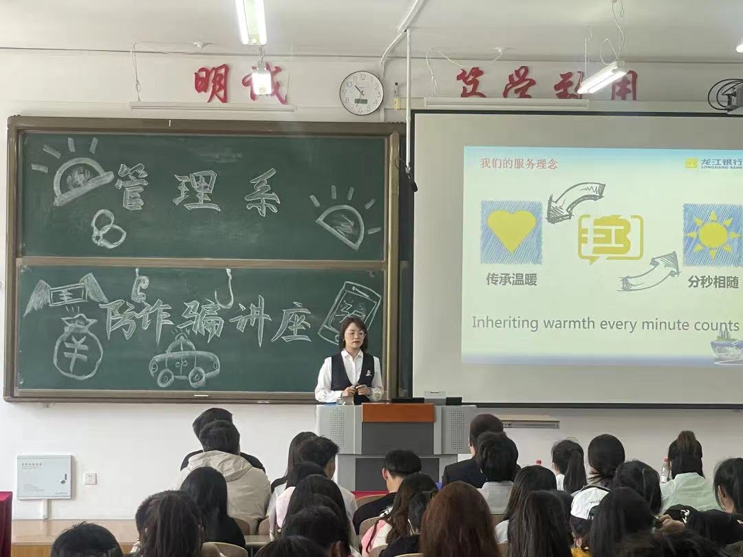 为进一步提高大学生的防诈、识骗能力,做好防范诈骗的准备工作,增强学生的自我防骗意识,强调做好防范诈骗工作的重要性,建设和谐平安的校园环境。哈尔滨金融学院管理系于2023年6月8日上午10:00组织开展防范诈骗讲座。管理系团总支副书记卞超凡老师,执行主席国心雨和主席董峻冶出席本次讲座,我系特邀普及金融知识教育宣讲师王磊,宋丹丹进行本次防范诈骗宣讲。