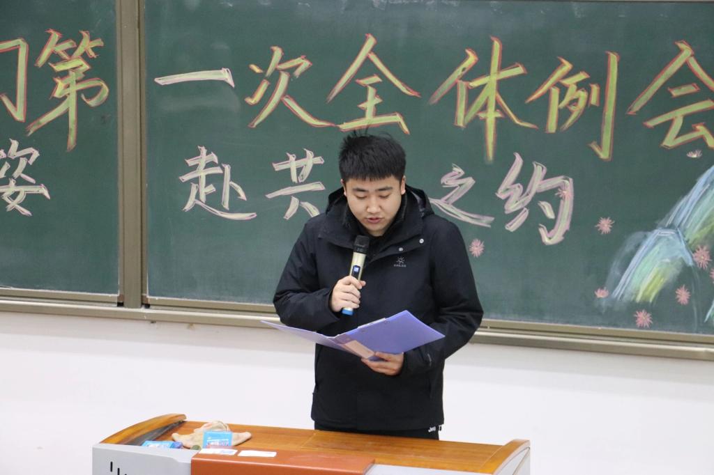 在工作部署环节,学生会执行主席曲炳旭以“复盘过往、展望未来”为主题进行工作汇报。他回顾过往工作中存在的不足,并以清晰的思路阐述新学期的工作规划。
