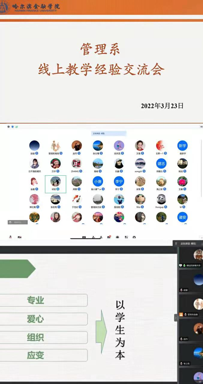 3月23日下午,管理系通过腾讯会议召开线上教学经验交流会,管理系主任姚旭、副主任柳欣和全体专任教师参加会议。会议主要围绕线上授课的经验分享、校级督导和系级督导反馈听课情况、线上授课教师遇到的问题等方面进行研讨交流。