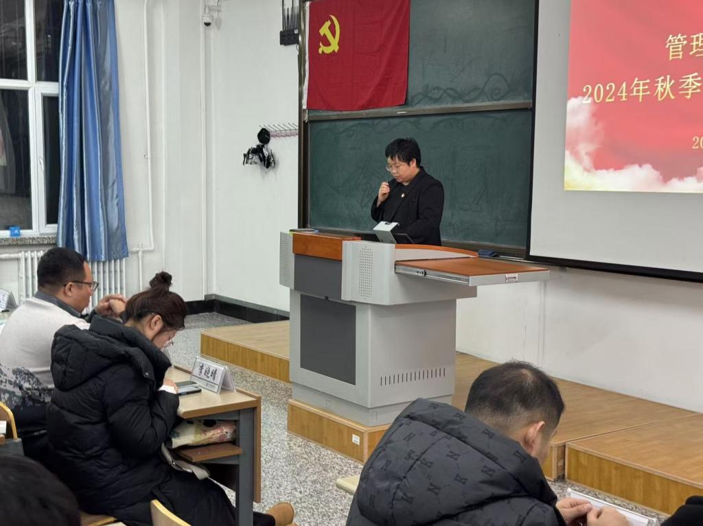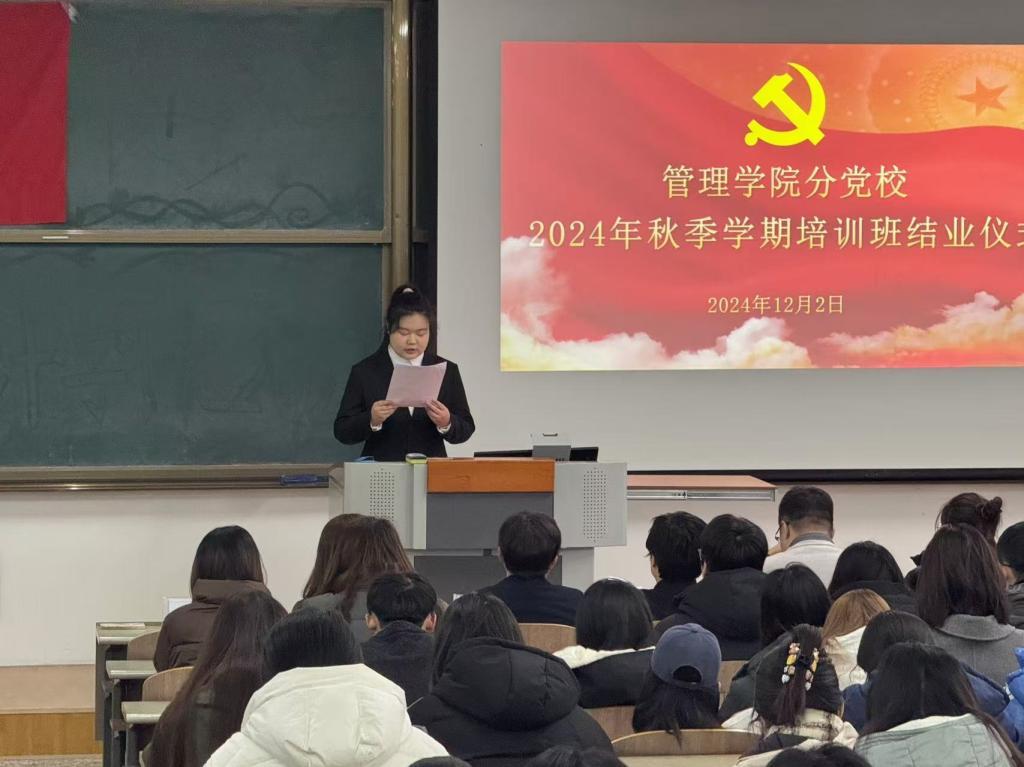 2024年12月2日,管理学院在综合楼124教室举行2024年秋季学期培训班结业典礼。学院党总支书记郭爽、党总支副书记赵丹丹、正处级组织员兼培训班班主任邱鑫、以及学院全体辅导员出席仪式。仪式由学院组织员兼培训班班主任王飞老师主持,123名参训学员全部参加活动。