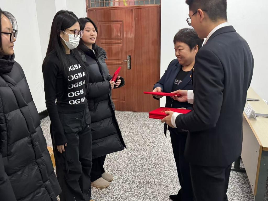 随后组织员邱鑫宣读毕业学员名单,表彰他们在培训过程中的优异表现。学院党总支书记郭爽和副书记赵丹丹为学员代表颁发结业证书。