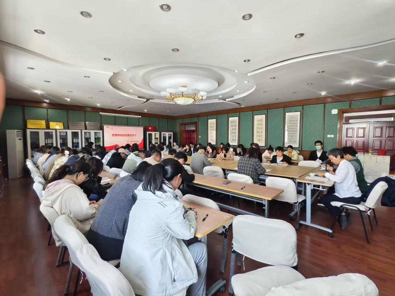 2025年4月23日下午,管理学院在经管楼313会议室开展政治理论学习,会议由党总支书记郭爽主持,全体教职工参加。