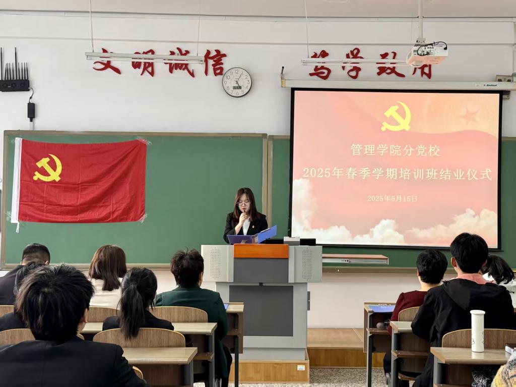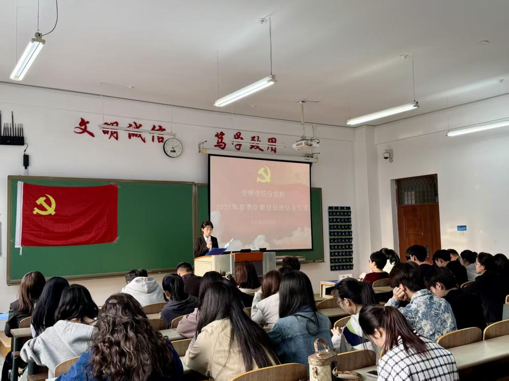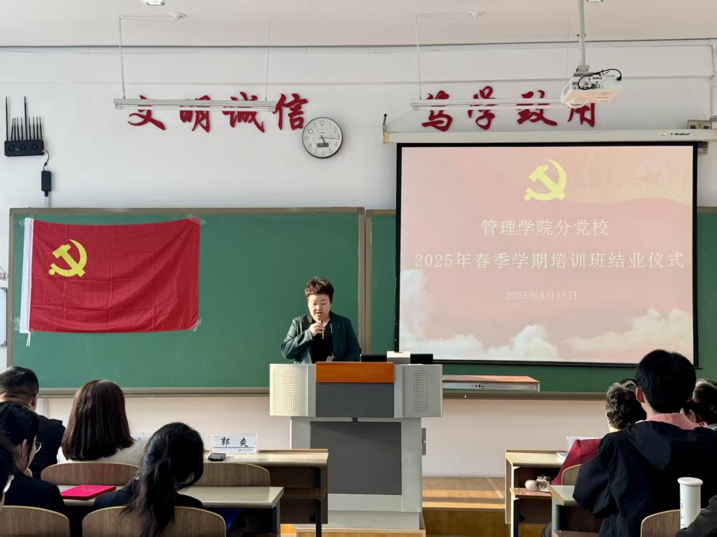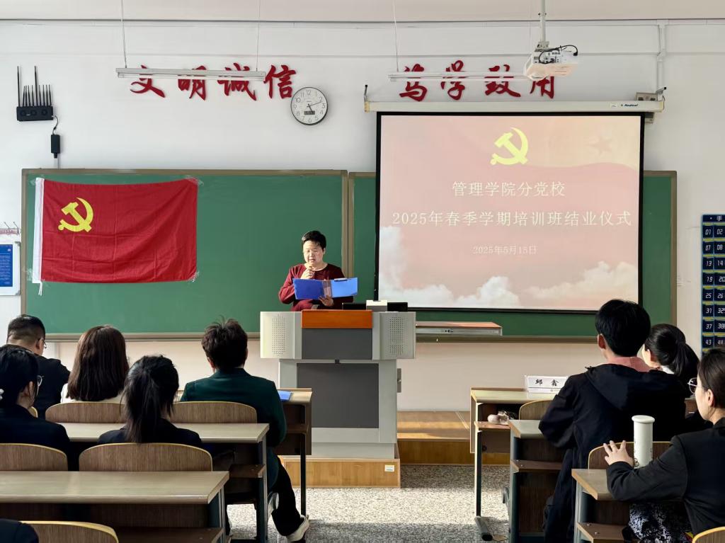 2025年5月15日,管理学院在综合楼218举行2025年春季学期培训班结业典礼。学院党总支书记郭爽、党总支副书记赵丹丹、正处级组织员兼培训班班主任邱鑫、以及学院全体辅导员出席仪式。仪式由学院组织员兼培训班班主任王飞老师主持,全体参训学员参加活动。