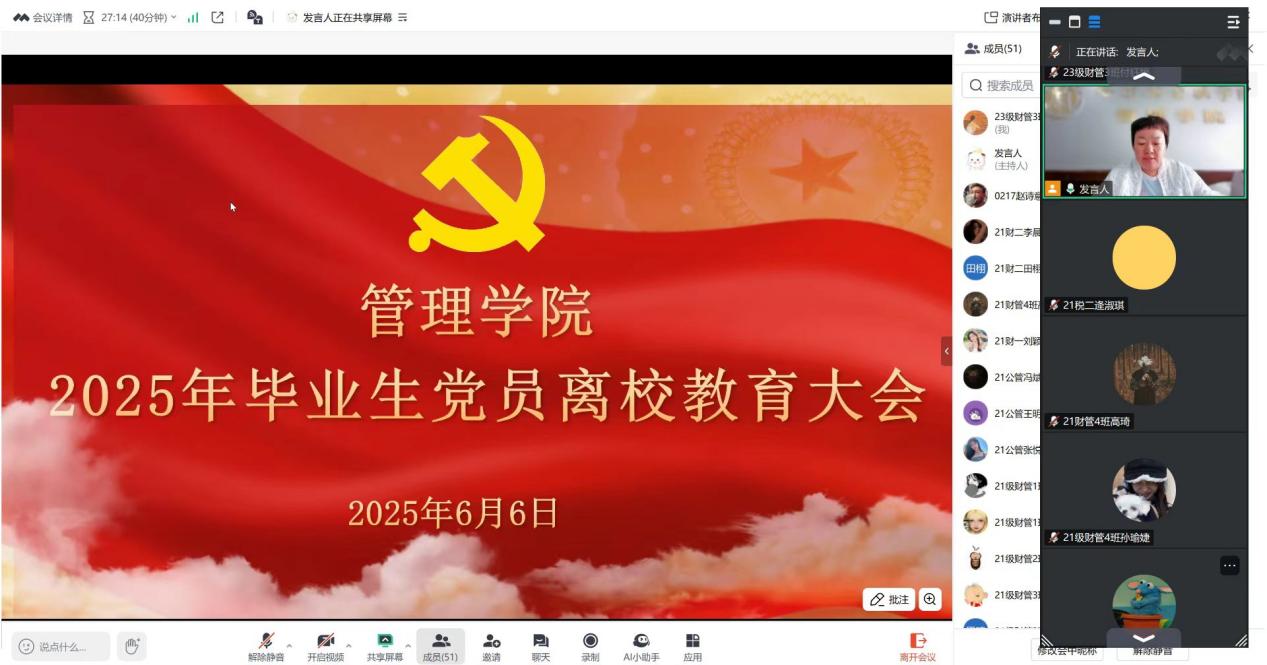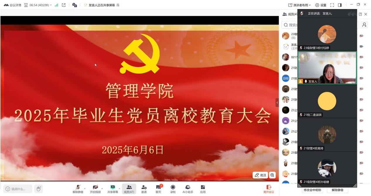 6月6日,管理学院召开2025届毕业生党员教育大会线上会议,学院党总支书记郭爽、正处级组织员邱鑫、组织员王飞、学生第一党支部书记李晓晴、学生第二党支部书记李琳和毕业班辅导员张雄、李家安,以及全体毕业生党员参会。会议由王飞主持。