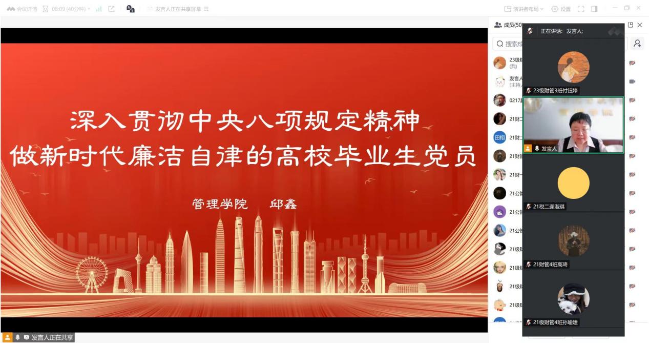 会议伊始,邱鑫老师以“深入贯彻中央八项规定精神,做新时代廉洁自律的高校毕业生党员” 为题讲授了主题党课。结合高校毕业生党员职业发展,以中央八项规定精神为指导思想,指出毕业生党员面临的作风挑战,叮嘱毕业生党员规范日常行为,严守纪律规律,积极担当作为,以廉洁为笔,书写青春答卷,将纪律规矩融入职业底色,永葆共产党人政治本色。