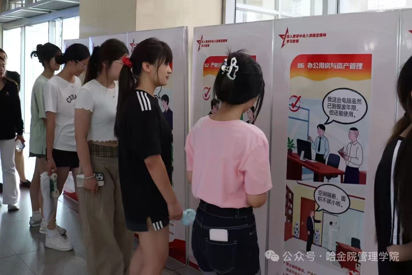 在综合楼一楼大厅的廉政宣传展区,师生们驻足凝视以中央八项规定精神为主题的系列展板。展览以“规定改变中国”为主线,援引详实数据、生动案例,通过鲜明对比,全景式呈现党的十八大以来作风建设取得的卓越成效,让“严纪律、守规矩”的要求直观可感。