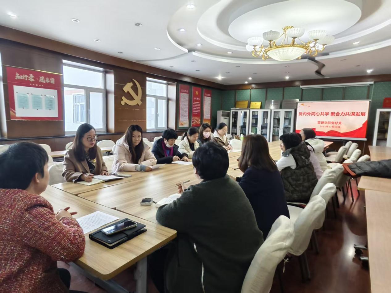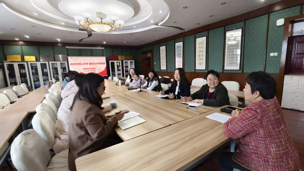 为进一步凝聚党内外人士思想共识、汇聚发展合力,2025年12月18日,管理学院党总支在经管楼313会议室接续开展党的二十届四中全会精神专题延伸研讨活动。学院党总支书记主持会议,8名党外知识分子代表(含4名民主党派教师、4名党外群众教师)与党总支成员齐聚一堂,以“党内外同心共学 聚合力共谋发展”为主题,开展深度交流研讨。