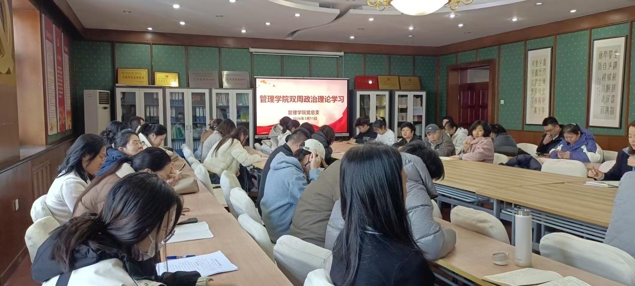 2026年3月11日,管理学院在经管楼313会议室召开双周政治理论学习会议,本次会议由学院党总支书记郭爽主持,全院教职工全员参与。